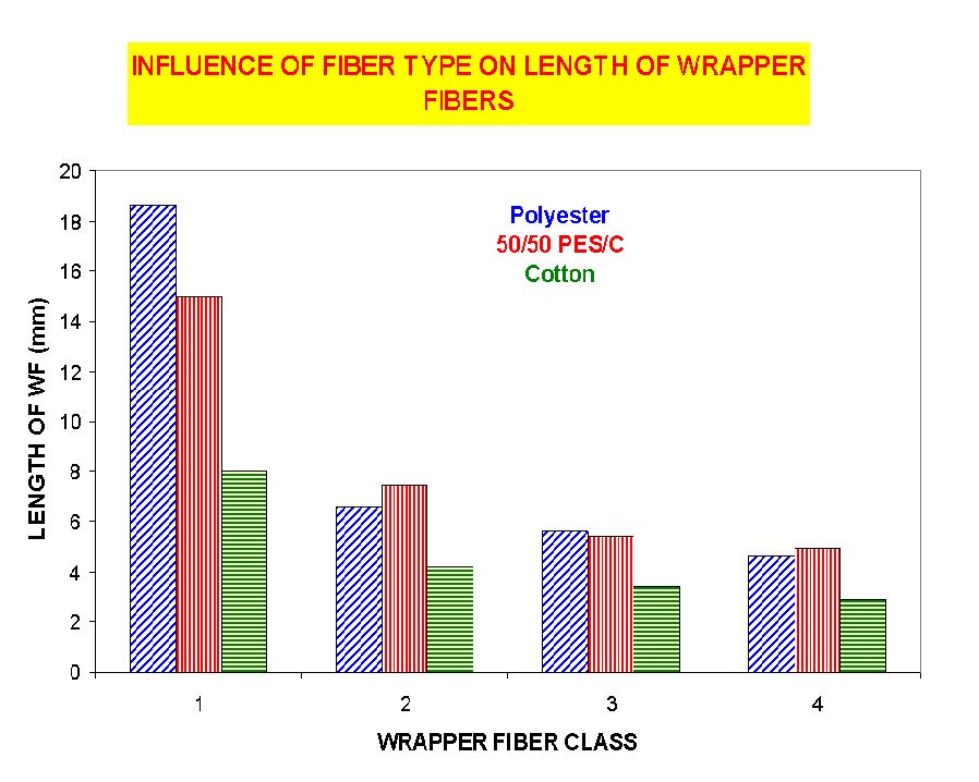 responsible for the yarn strength [7]. Analysis of different yarns indicate that while there are differences in the incidence of different classes of wrapper fiber, one of the most significant differences between polyester yarns and cotton yarns is the length of the class 1 wrappers. It is clearly shown in Figure 11 that the stronger polyester yarns have much longer wraps than the significantly weaker cotton yarns [1].