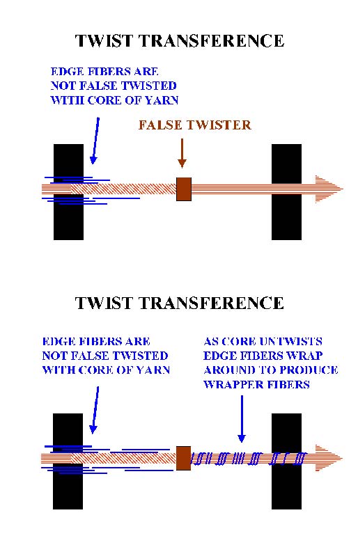 This yarn structure offers many potential advantages, one of the most important being that since no real twist is present in the final yarn it should be possible to achieve high production rates. The potential of using twist transference (see Figure 1) to create this “new” yarn structure was first promoted by Du Pont in their early patent (Figure 2), which utilized an air-jet to false twist the yarn [5]. While there were several publications concerning possible merits of the yarns produced, this system achieved little commercial success.