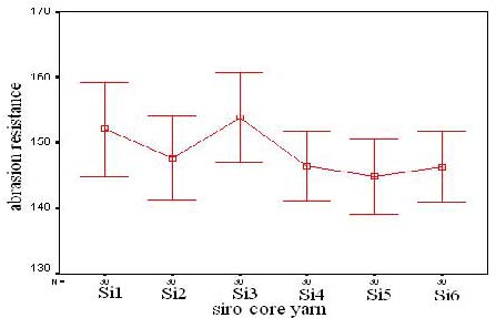According to Fig 17 Ring core spun yarn has the least abrasion resistance and Ring and Siro yarns are almost similar. The least unevenness percent is for sample Si2 (Siro) and there is a significant statistical difference between it and Ring core spun yarn (Fig 18).